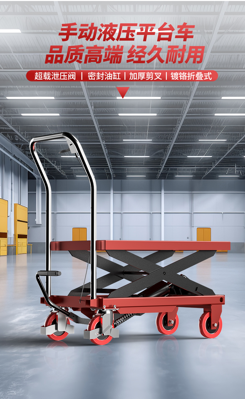 揚(yáng)子液壓平臺(tái)車TF,高強(qiáng)度加厚鋼板,質(zhì)量加固,高品質(zhì)尼龍PU輪,使用壽命更長(zhǎng),全封閉油缸。杜絕漏油